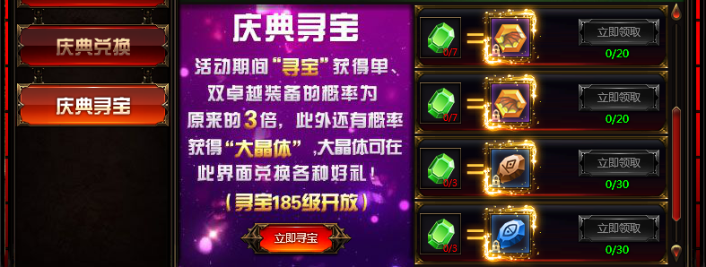 活动内容:玩家在寻宝中有概率可获得大晶体,使用大晶体可兑换游戏中稀有道具,详情请根据游戏中活动兑换页面为准。