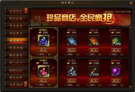 活动期间,每天会随机刷新一批特价道具,花费少量元宝即可购买,每个道具均有每天最大个人购买次数限制,部分道具有购买vip等级限制,买到就是赚到,机会不容错过!
