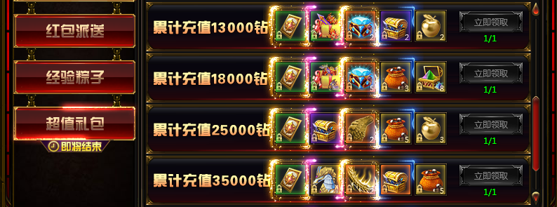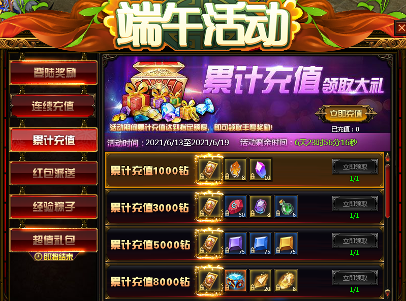 活动内容:玩家在活动时间内,累计充值达到一定钻石即可获得丰厚礼品,超值奖励等你来拿!