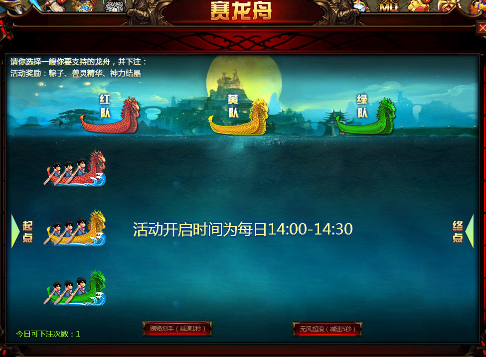 2. 活动开启的前五分钟为报名时间,届时可以选择三支队伍中你所支持的龙舟并下注。