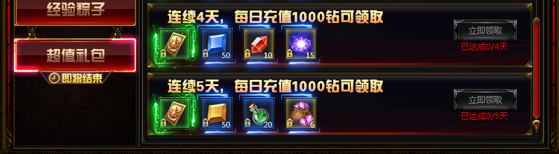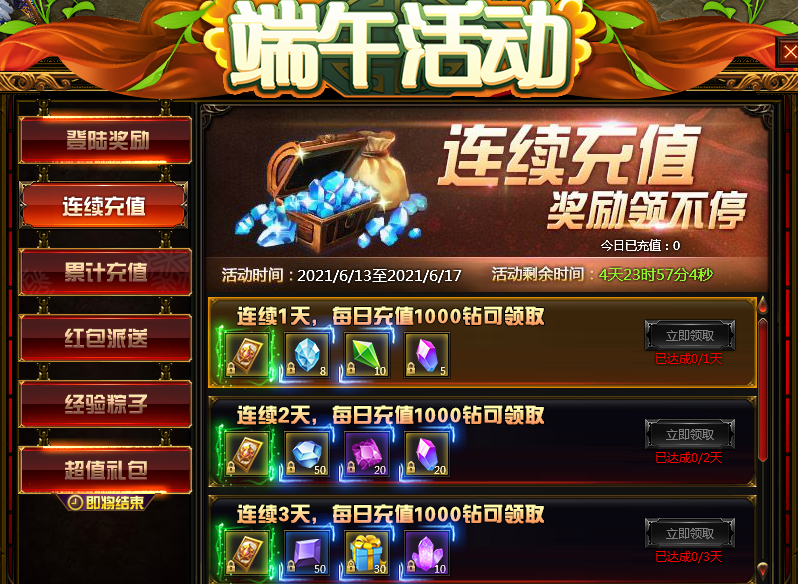 活动内容:活动时间内,玩家每日充值达到1000钻,即可获得丰厚奖励!