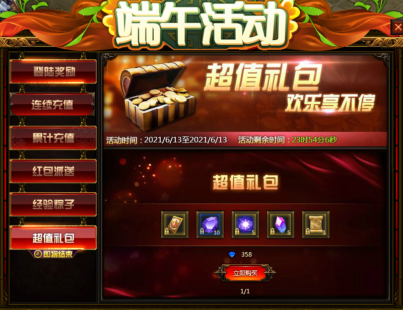 活动内容:活动时间内,玩家可在超值礼包内查看每日购买内容,超值礼包每日仅可购买一次且仅限当日购买。机不可失,赶快来购买吧。