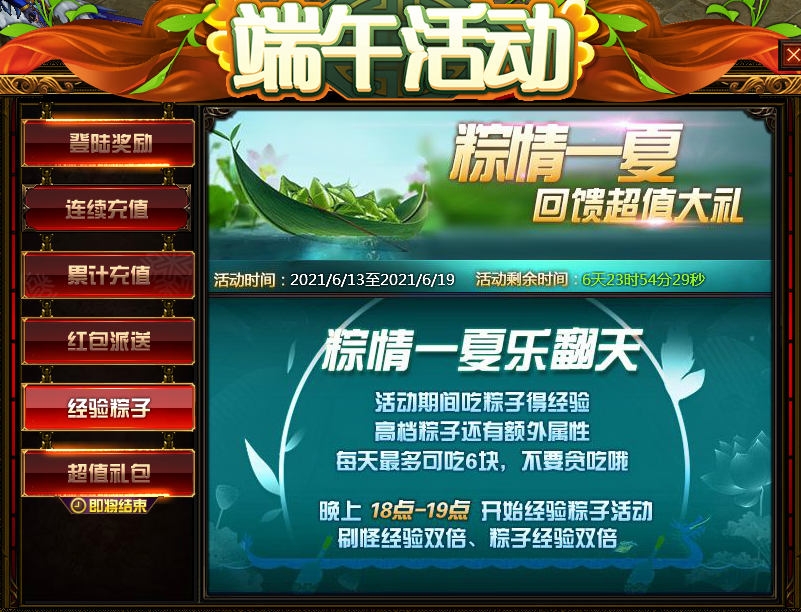 3. 粽子在每天晚上18点-19点期间食用,经验效果将翻倍。
