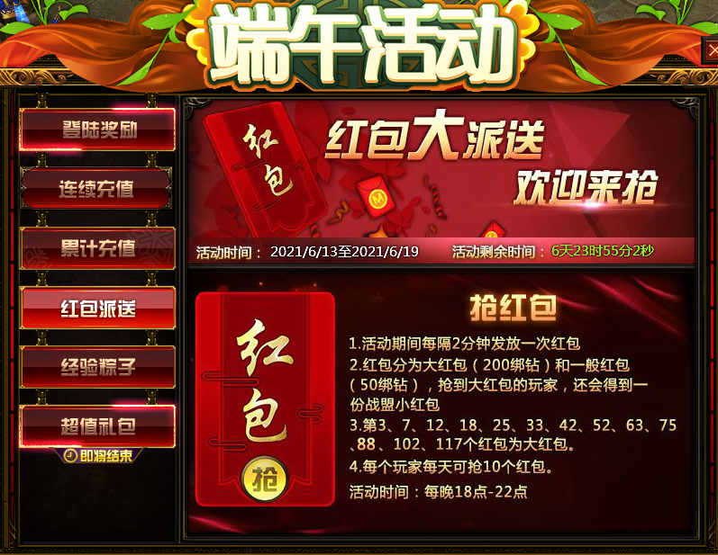 活动内容:玩家在活动期间,全服玩家同时抢金秋红包,每人每天最多抢10次,还有大大红包等你来抢!
