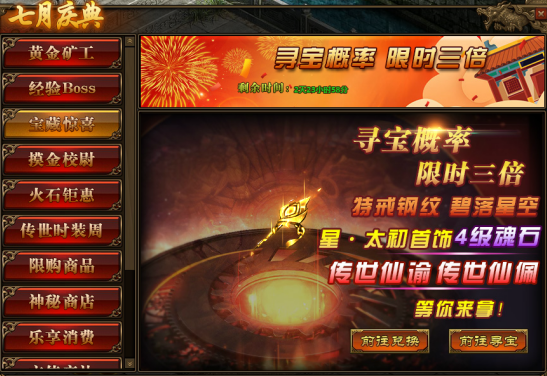 1.活动期间,玩家寻宝概率翻倍,极高几率获得星·太初首饰,传世灵器、传世灵甲,特戒钢纹,仙元石、碧落星空,传世灵器、传世灵甲,高级天魂石、四级魂石,传世灵器·仙谕以及传世灵器·仙佩