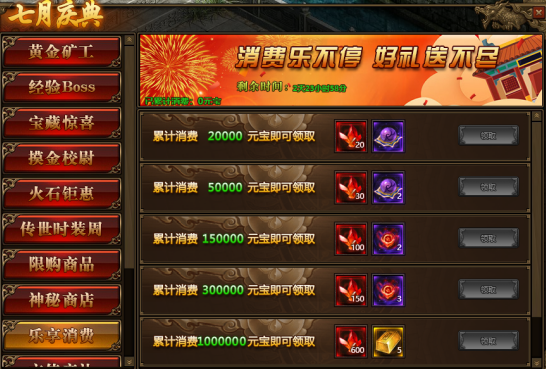 1.活动期间,玩家累计消费满足要求,可以领取境界修为、本职业星石、传世灵戒等相应奖励;