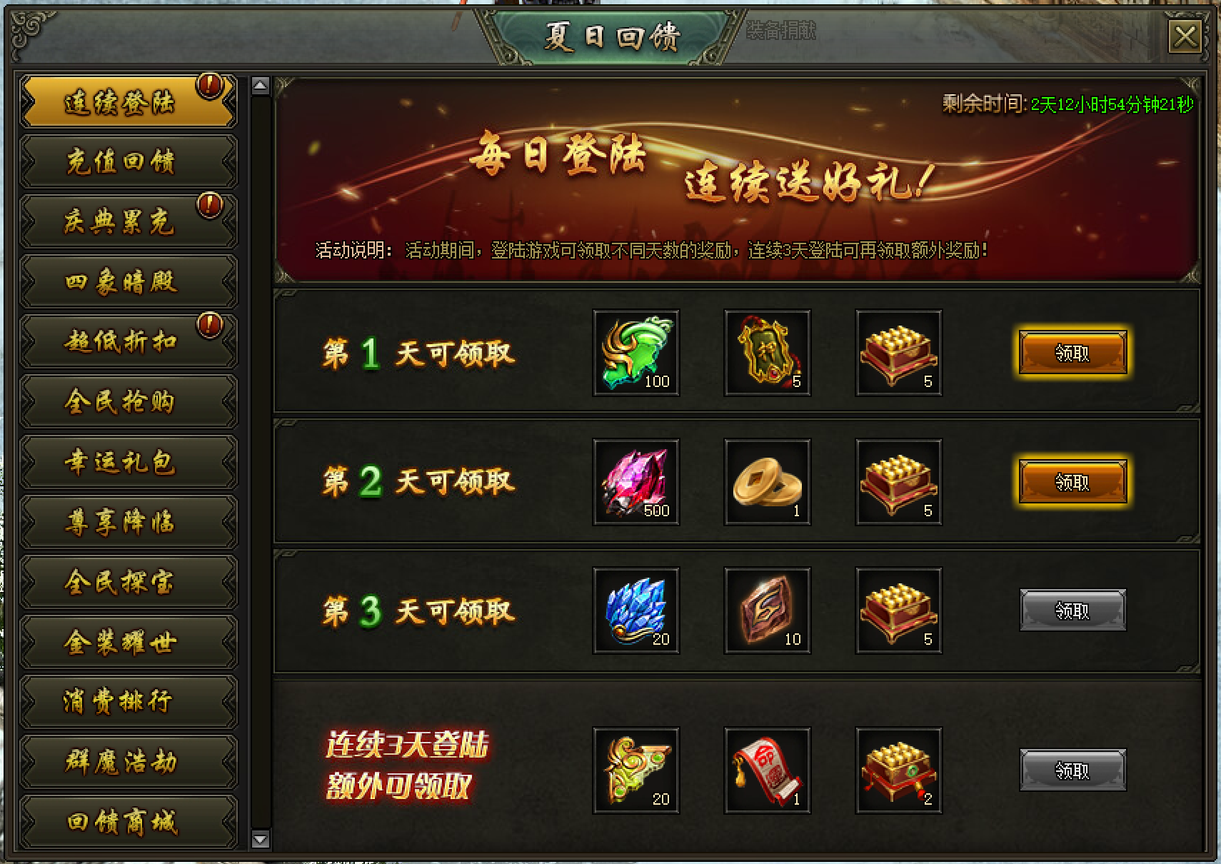 活动说明:活动期间,每天登陆游戏即可领取奖励,连续3天登陆更可获得额外奖励。