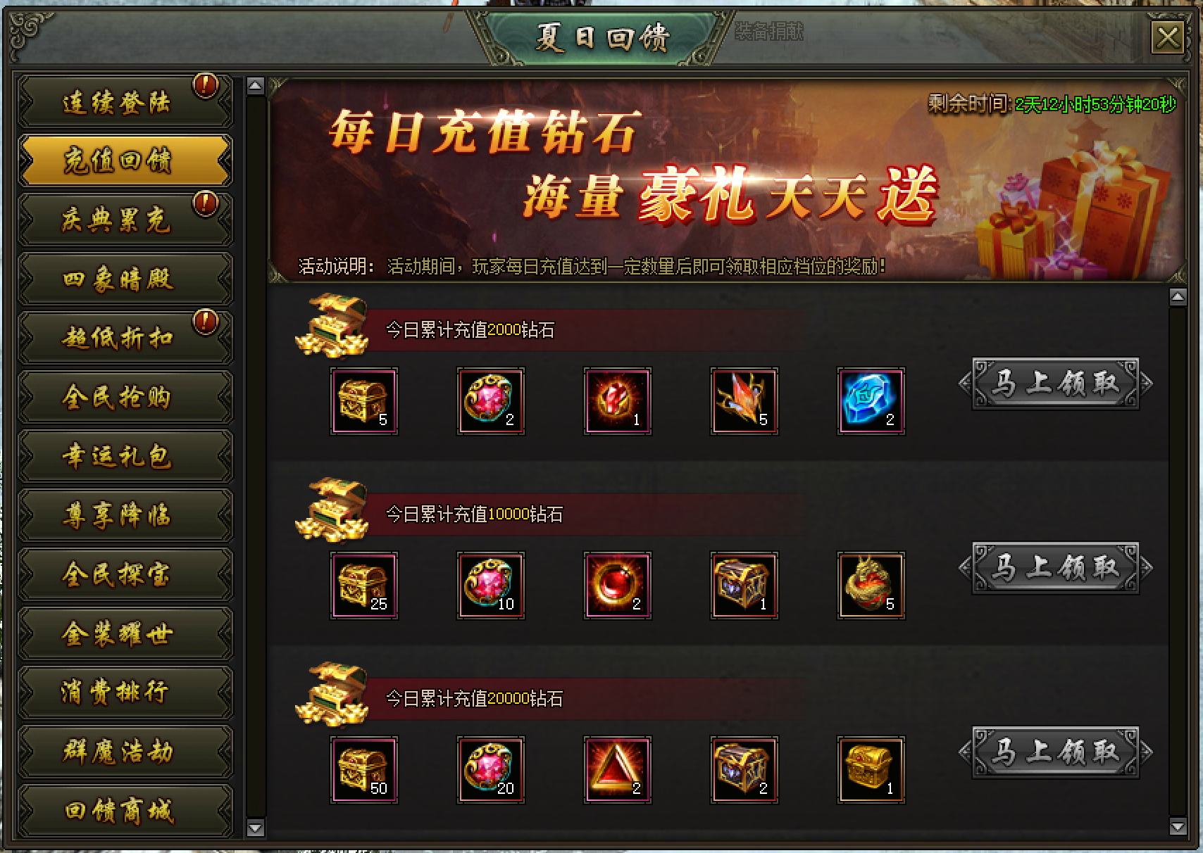 活动说明:活动期间,每日充值达到指定额度,即可领取超值豪礼。