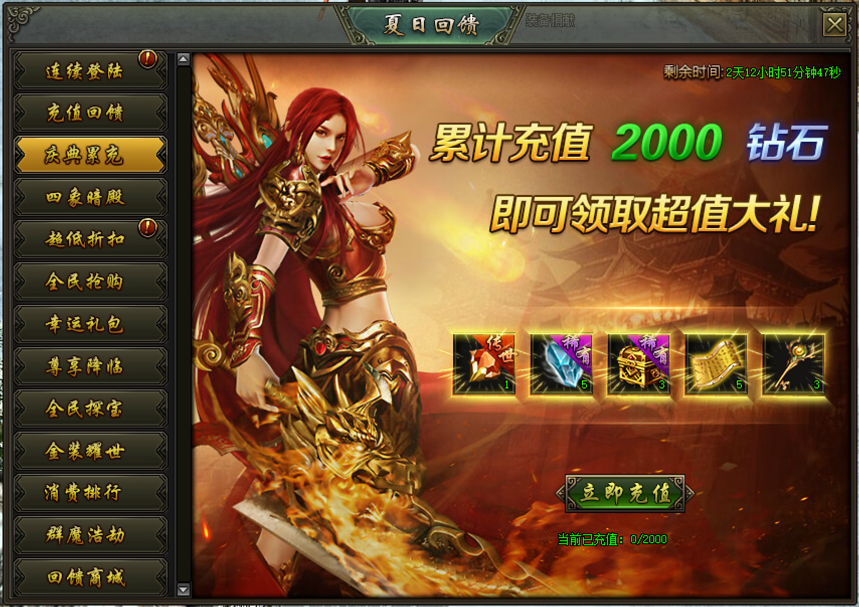活动说明:活动期间,累计充值达到指定额度即可领取超值大礼!