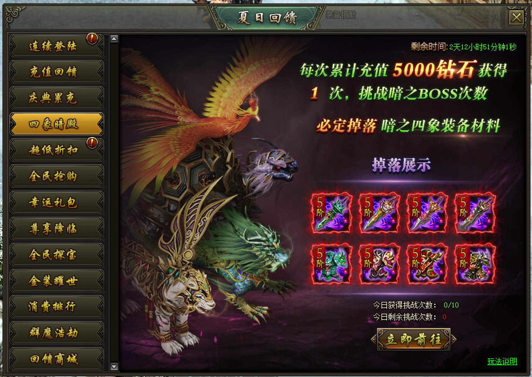 活动说明:活动期间每累计充值5000钻石即可获得1次四象暗殿挑战次数,必定掉落暗之四象装备。