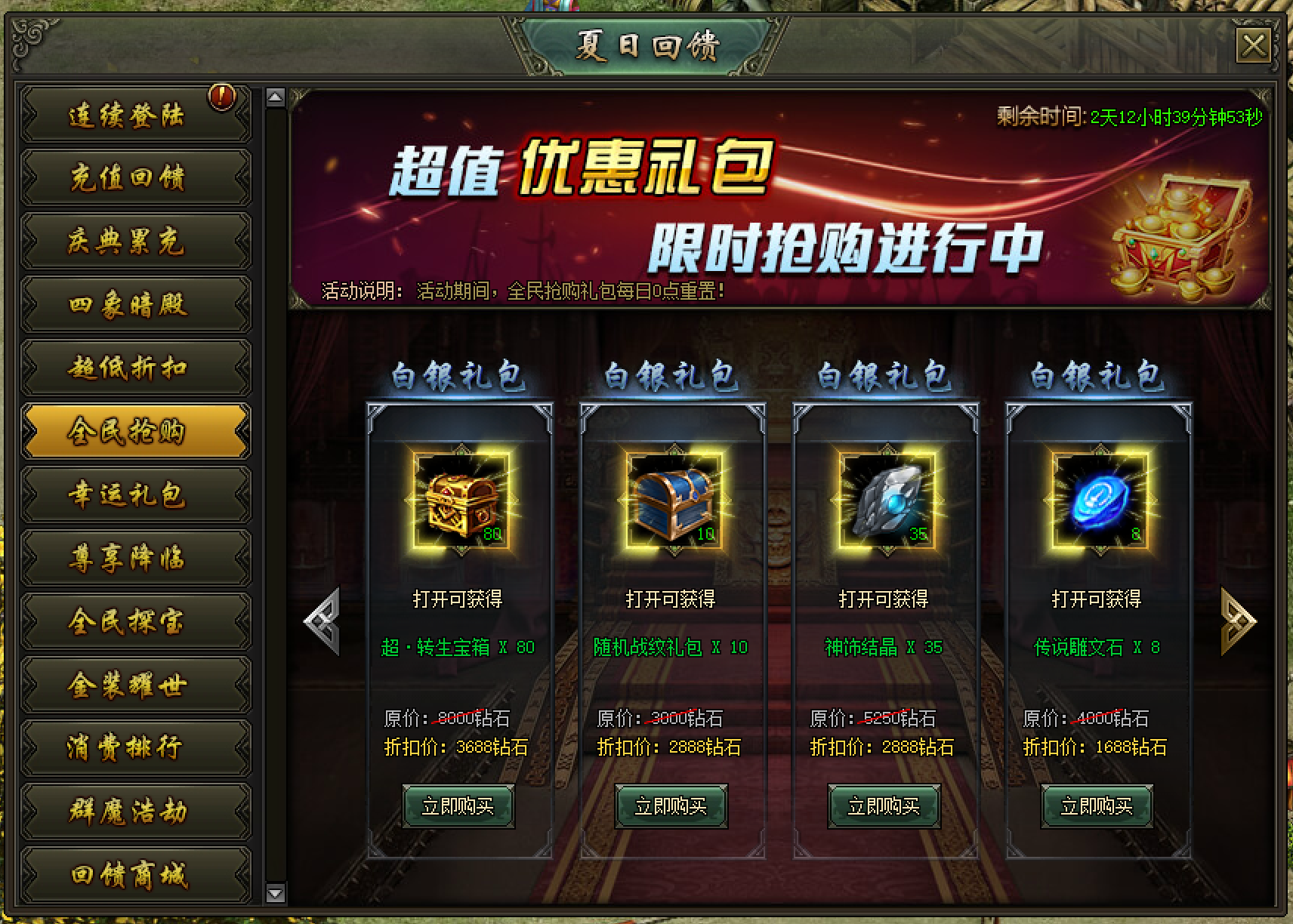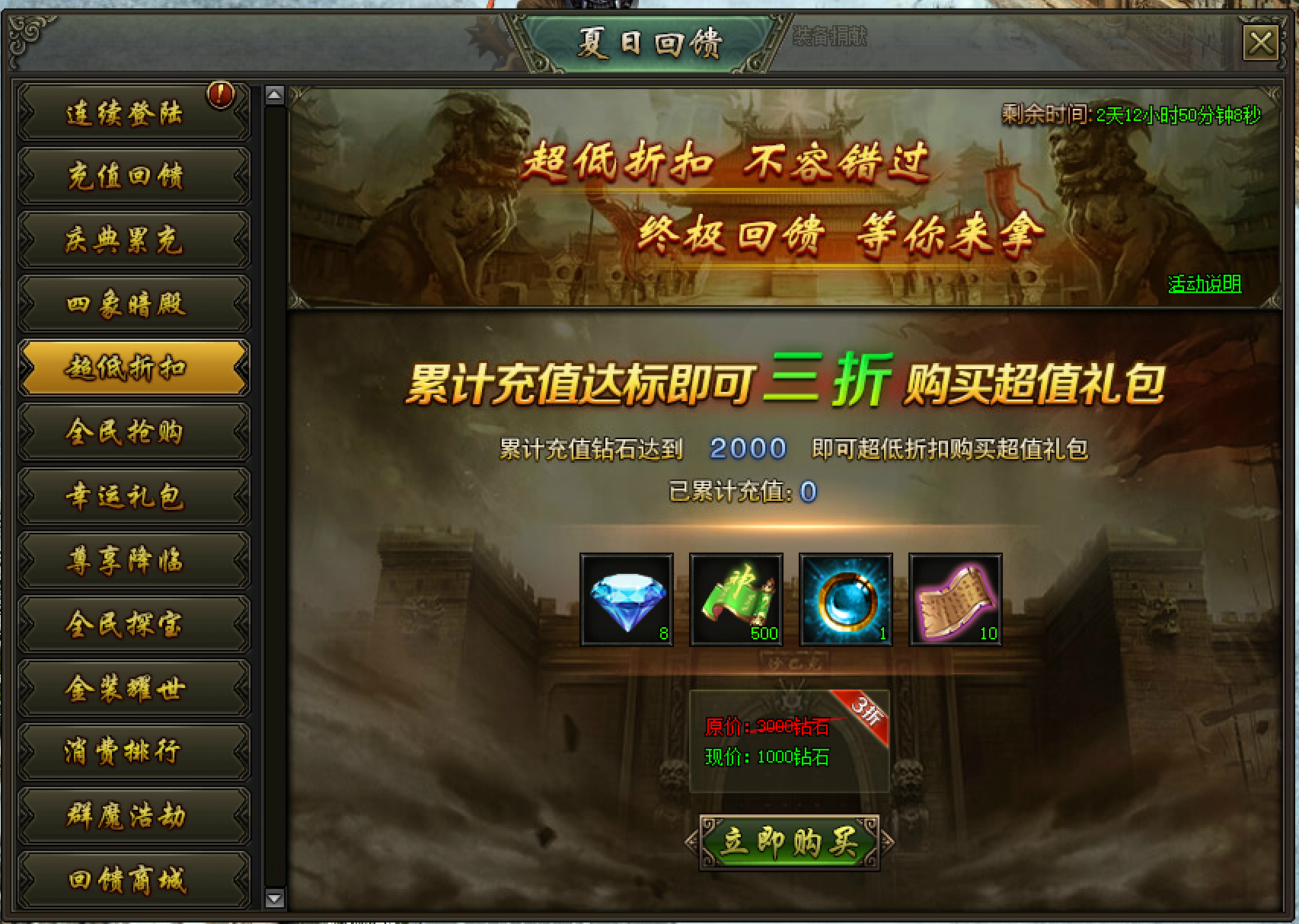 活动说明:活动期间,玩家累计充值达到指定额度,即可超低折扣购买礼包。