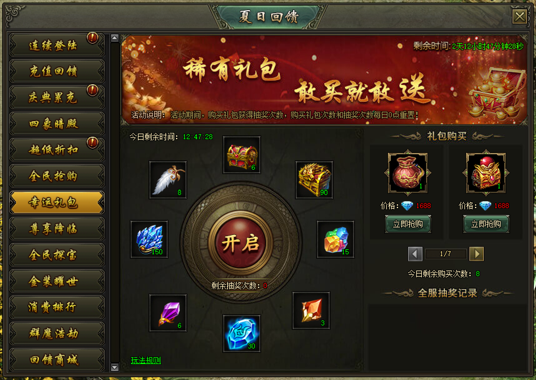 活动说明:活动期间,购买礼包获得抽奖次数,购买礼包次数和抽奖次数每日0点重置。