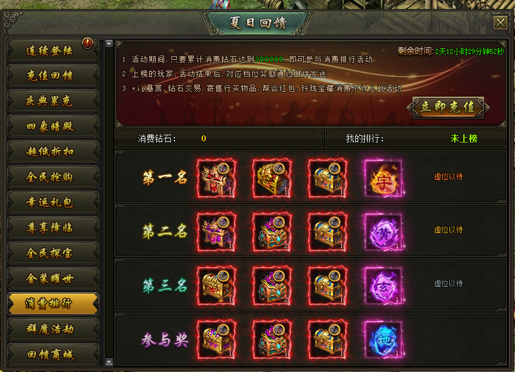 活动说明:活动期间,累计消费达到300000钻石的玩家参与排行,奖励在活动结束后以邮件的方式进行发放。