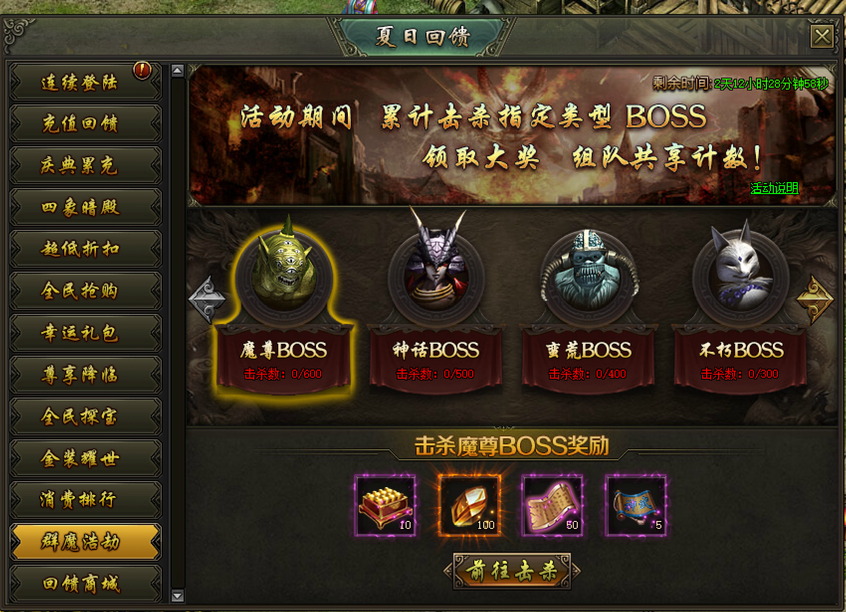 活动说明:活动期间,击杀指定类型的BOSS,即可领取大奖!