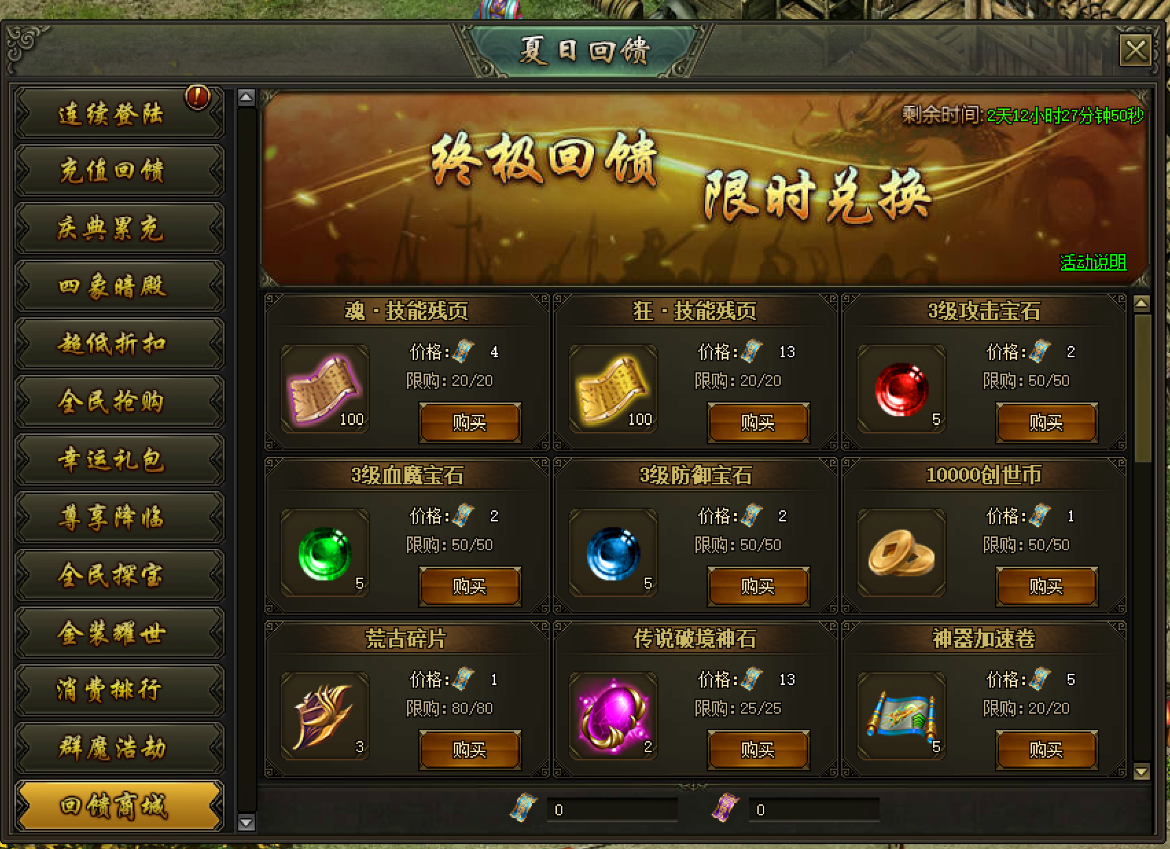 活动说明:活动期间,可使用充值回馈卷和消费回馈卷兑换大量奖励!