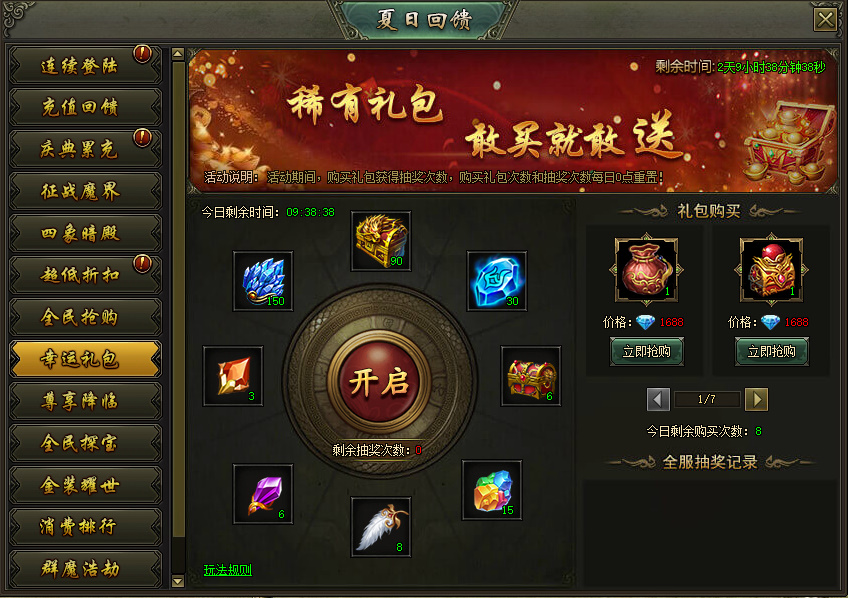 活动说明:活动期间,购买礼包获得抽奖次数,购买礼包次数和抽奖次数每日0点重置。