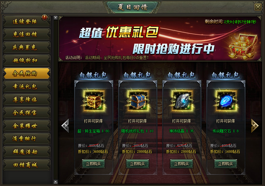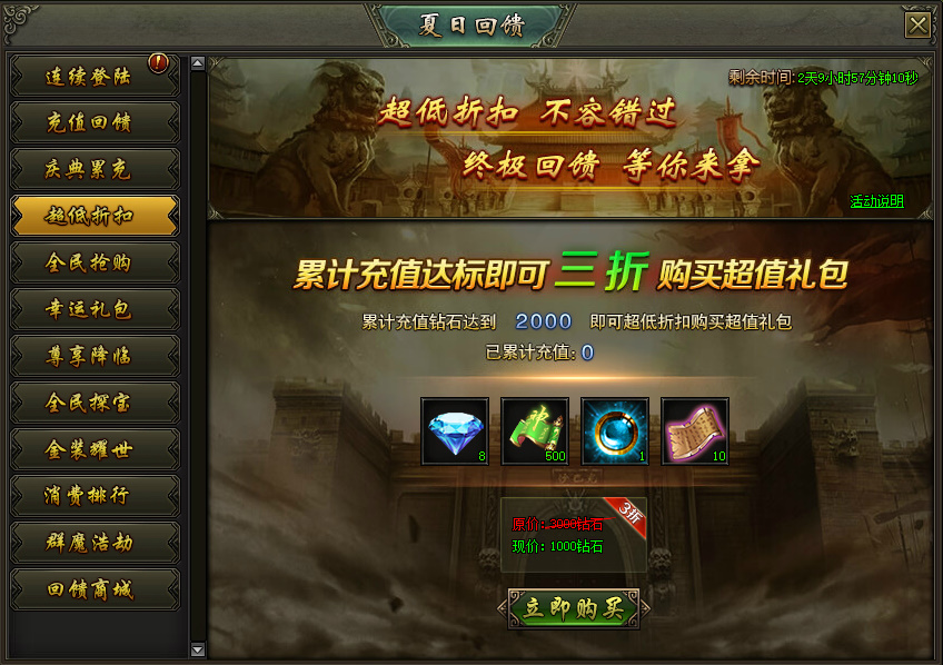 活动说明:活动期间,玩家累计充值达到指定额度即可超低价格购买礼包