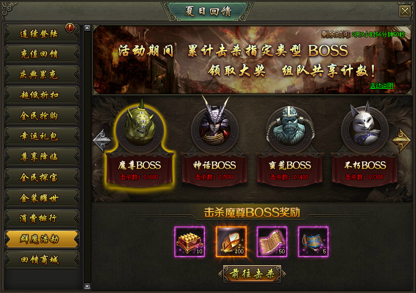活动说明:活动期间,累计击杀指定类型BOSS,可领取超值奖励!