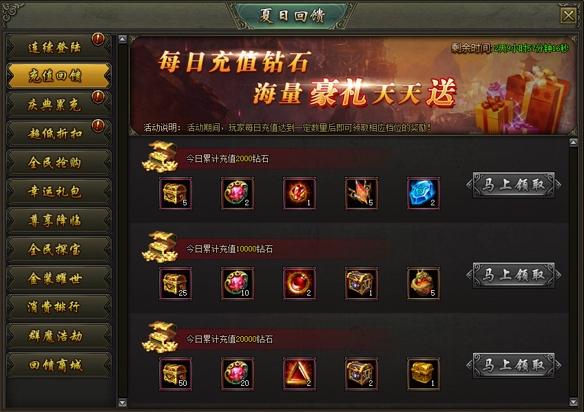 活动说明:活动期间,每日充值达到指定额度,即可领取超值豪礼,每种档位可领取1次