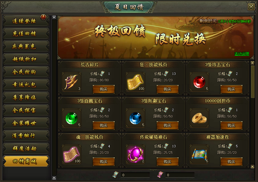 活动说明:活动期间,可使用充值回馈卷和消费回馈卷兑换大量奖励!