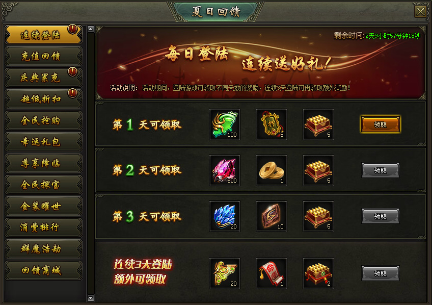 活动说明:活动期间,每天登陆游戏即可领取奖励,连续3天登陆更可获得额外奖励