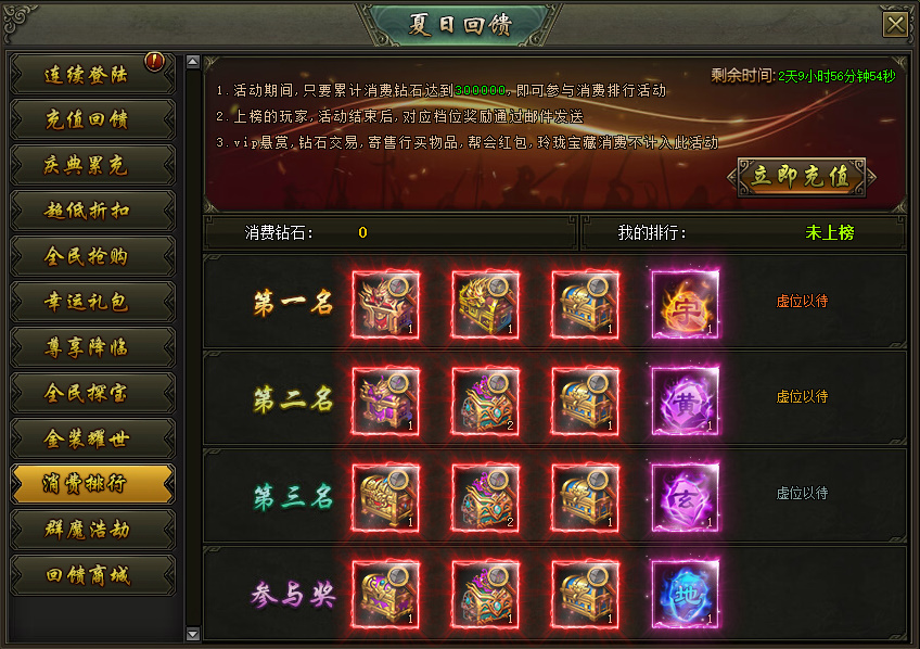 活动说明:活动期间,累计消费达到300000钻石的玩家参与排行,上榜的玩家奖励在活动结束后以邮件的方式进行发放