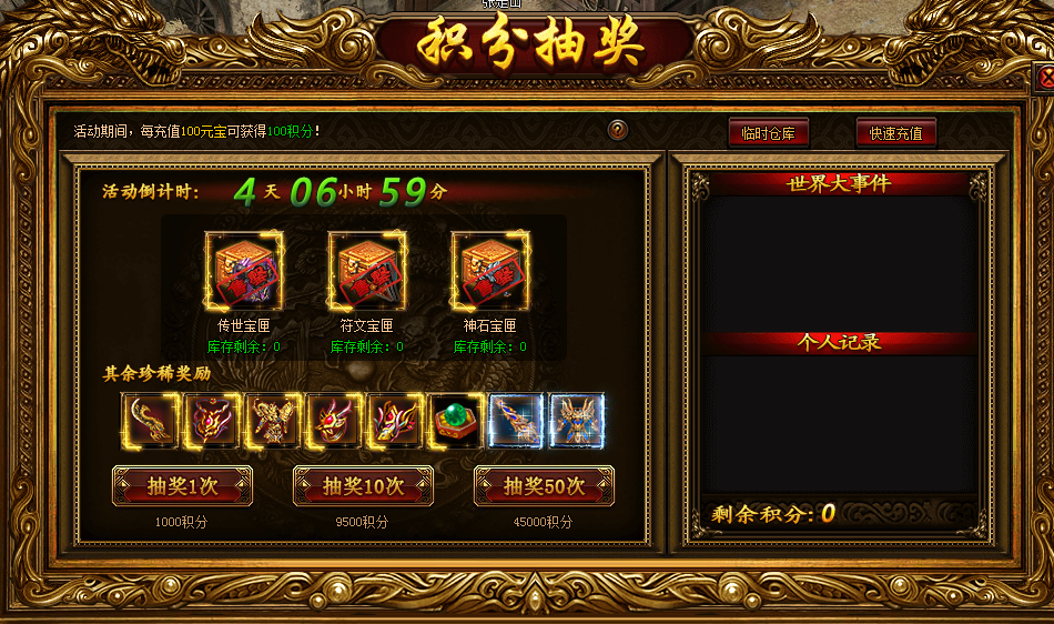 活动期间,每充值100元宝可获得100积分!积分可用来积分抽奖,保底大奖:神石宝匣(打开可获得锻造神石*180)、9转符文、传世宝匣等你来拿!