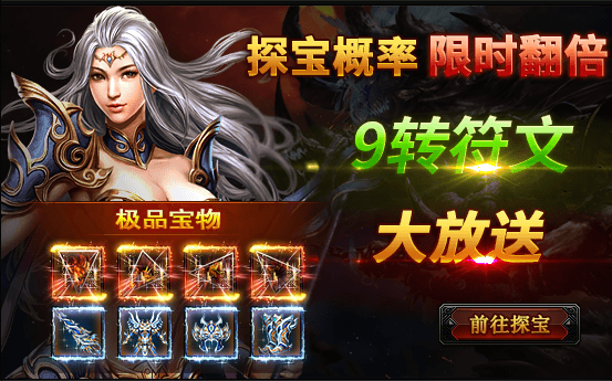 活动期间内,探宝概率翻倍;并有较大概率获得9转符文、高转装备、霸王神装、等极品道具!