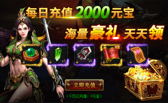 活动期间内,每天充值2000元宝可以领取1000W经验,暗器结晶,成就令牌,探宝符、8小时三倍经验符等海量道具!