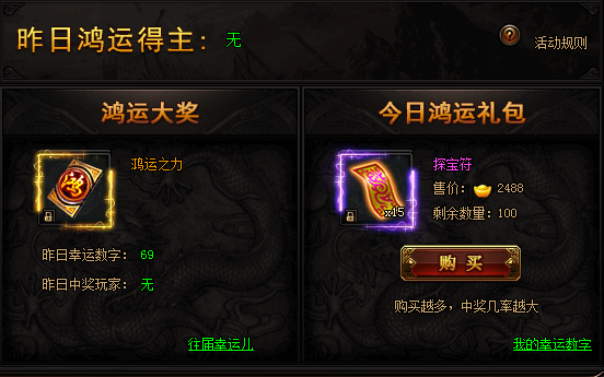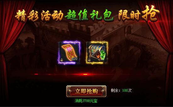 活动期间,购买限购礼包赢取幸运大奖,奖励极品限时称号。(全服限量买到即赚到)购买礼包越多,中奖几率越大!