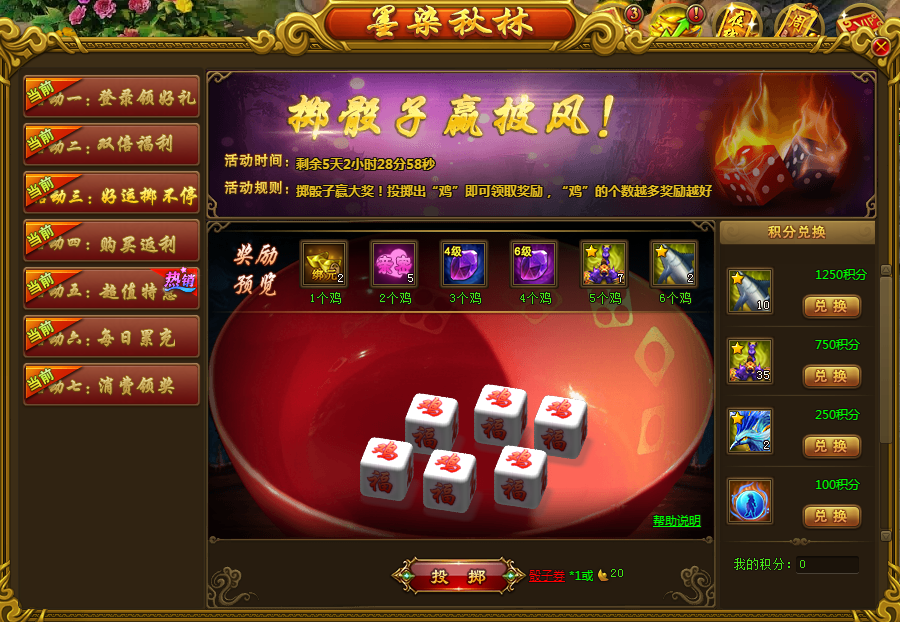 活动规则:掷骰子赢大奖,投掷出“鸡”即可领取奖励,“鸡”的个数越多奖励越好。