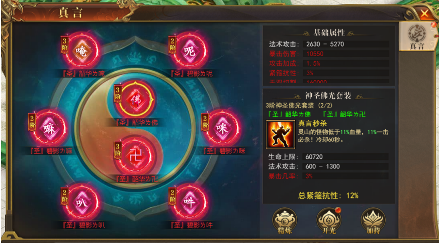 真言开光--可使用佛门开光石对真言进行开光,每件有5个属性槽位可使用开光石进行解锁,