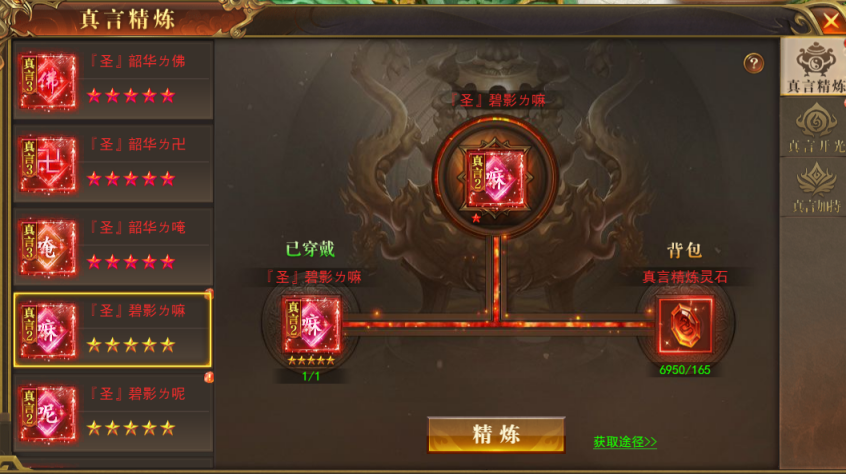 回收真言装备可获得精炼石