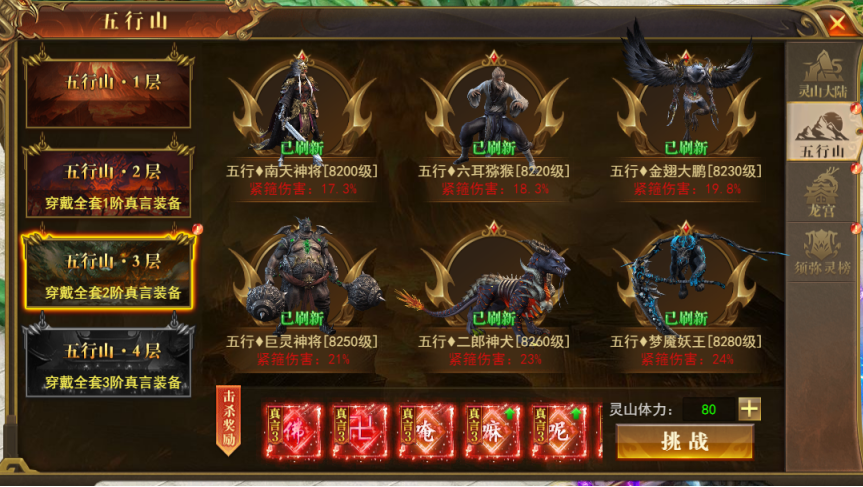 入口:灵山大陆-五行山,开服满40天开启,主要掉落真言装备和材料