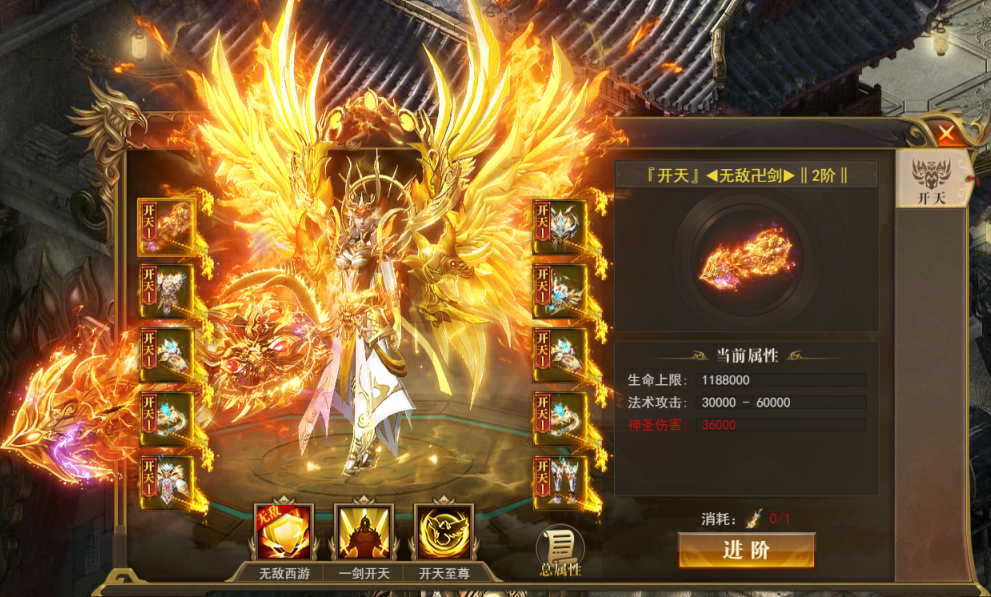 7、新增开天无敌神装,开服30天开启,入口:仙装旁 至尊 图标;穿戴可获得超高战力,还可激活无敌西游、一剑开天、开天至尊特殊效果