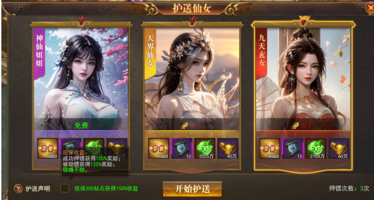 2. 玩家可直接护送神仙姐姐,也可消耗护送令接取天界仙女或九天玄女,档次越高,护送完成的奖励越高。
