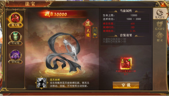 法宝系统分先天法宝(混天绫、生死簿、妖鳳扇),后天法宝(乾坤圈、玲珑塔)。