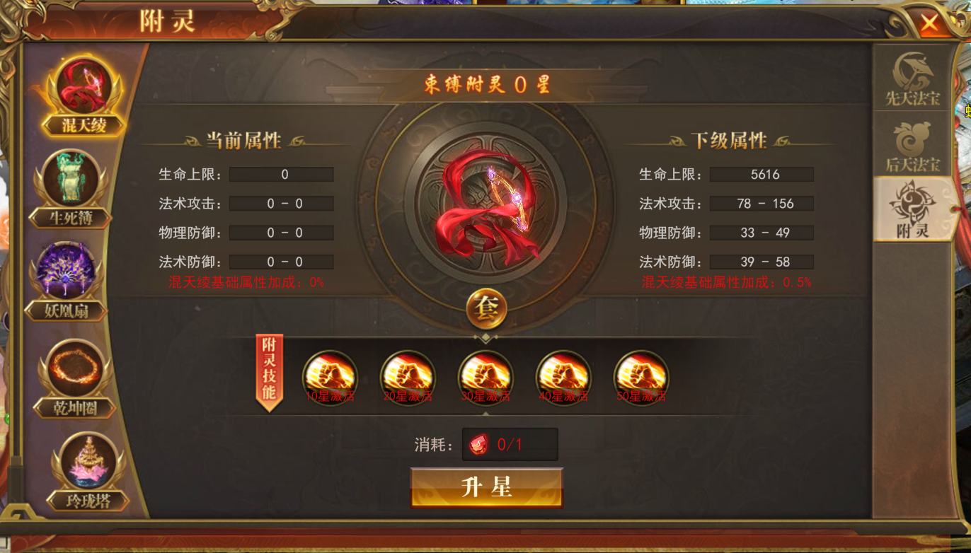消耗对应附灵石可提升法宝属性,达到一定星级可激活增加法宝额外加强效果