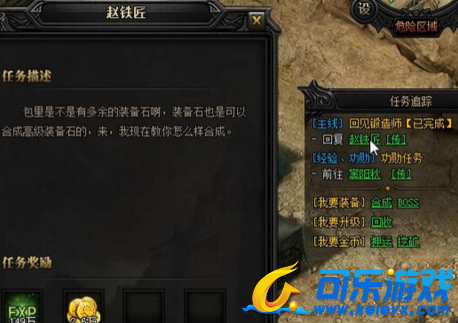 主线任务变更为:回见锻造师。任务目标是回复赵铁匠。我们现在所处的区域是危险区域,小心被敌人干掉。这里开始接任务速度要快,遇到PK红名能逃则逃。走路记得用右键。赵铁匠:包里是不是有多余的装备石啊,装备石也是可以合成高级装备石的,来,我现在教你怎么样合成。任务奖励:经验*149万,金币*2.6万。