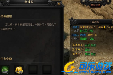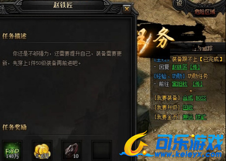 之后,赵铁匠继续对玩家说。赵铁匠:你还是不够强力,还需要提升自己,装备需要更新,先穿上1件50级装备再前进吧。任务奖励:经验*148万,金币*2.6万,黑铁矿石*10个。