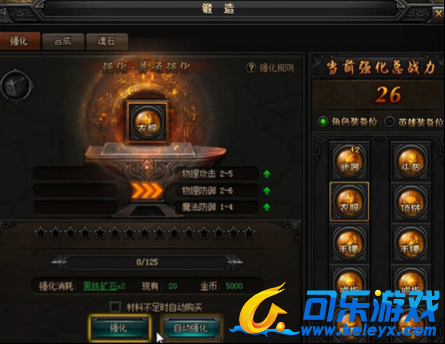 黑铁矿石。等级:32级。道具类型:强化石。用于将装备强化到+1至+15。双击道具可快速打开锻造面板。获得方式主要有:商城购买、矿洞挖矿。打开锻造窗口。点选默认的强化选项卡,里面有我们刚刚强化过的武器+2,这里我们不再强化武器,而是强化衣服。选择右面的装备衣服。选中衣服后,强化·普通强化槽里出现的就是衣服了,由于是第一级强化,所以数值并不是相当到可观。物理攻击2-5,物理防御2-6,魔法防御1-4。强化消耗:黑铁矿石*2,金币*5000。玩家可以在此选择强化或是自动强化。强化的话速度慢,但可以有得放矢,而自动强化就会一次性消耗完所有的黑铁矿石和金币,到一方变红不能再强化为止。依照我们现有的黑铁矿石数量,可以强化至2星。