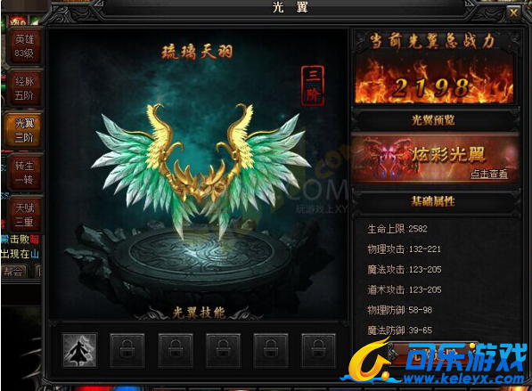 在可乐游戏蓝月传奇游戏里,当你激活了英雄翅膀,进入英雄界面里的时候,左侧标签第3个选项,便是英雄翅膀的进阶界面。大家点击“光翼进阶”就能进入翅膀进阶操作界面,再通过“开始培养”或“自动培养”选项,就能消耗一些金币,从而提升英雄翅膀等级。