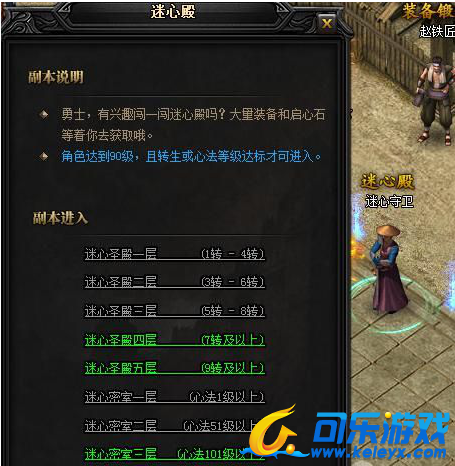 可乐游戏《蓝月传奇》游戏中,90级玩家们且转生或心法等级达标才能进入迷心殿。迷心殿可通过位于盟重省的NPC迷心守卫(117,97)传送进入,“迷心殿”由5层迷心圣殿和3层迷心密室组成,玩家只能进入符合当前转生或心法等级的地图。