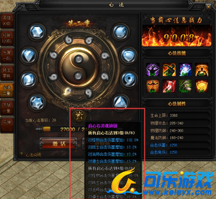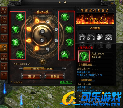 修炼心法不但可以提升英雄各项属性,提供超强的合击伤害及合击免伤属性加成,并且还可解锁“启心石“玩法