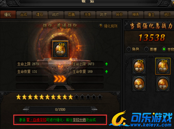 强化白虎圣印可以提升英雄的生命上限以及生命恢复;