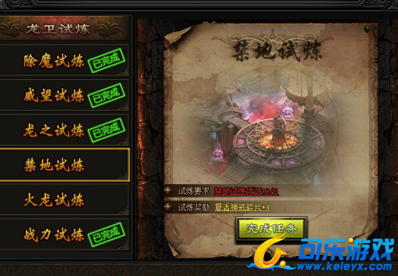 禁地试炼:完成条件是提交禁地试炼凭证5个,该凭证可以在每日充值副本-龙之禁地获得;