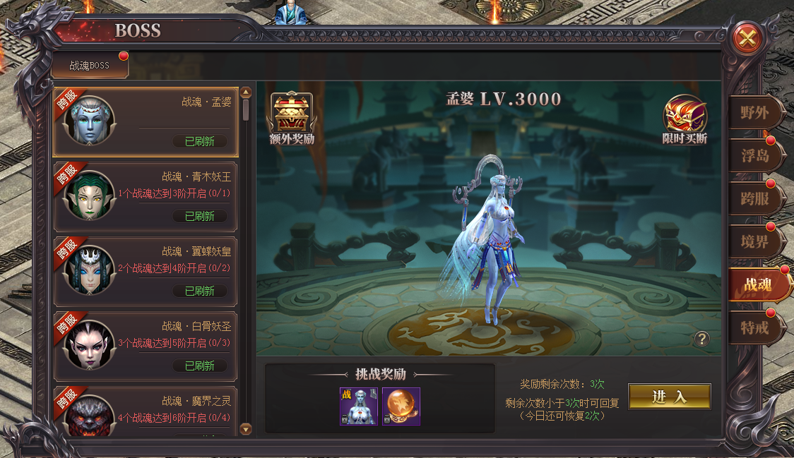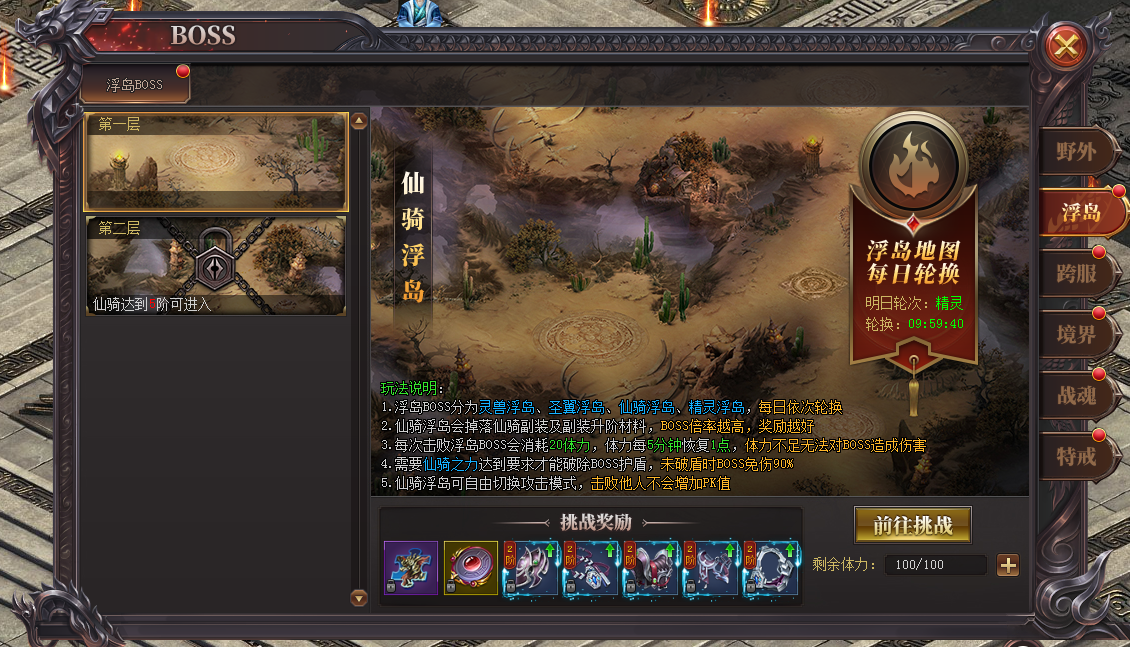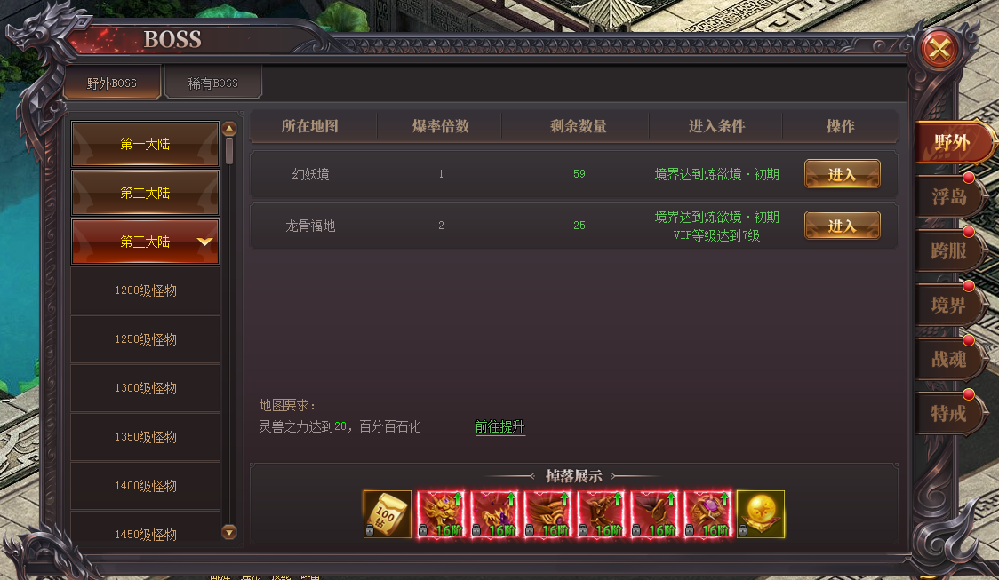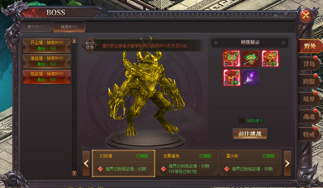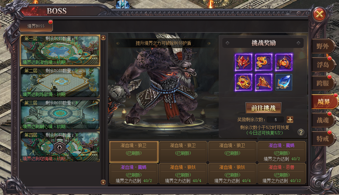 提升可以挑战更高级的境界BOSS,需要使用境界之力破除BOSS护盾。境界BOSS会掉落境界装备和境界装备强化石