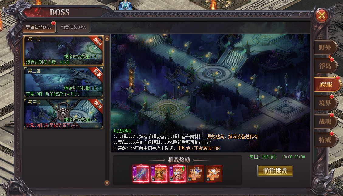 跨服BOSS又分为荣耀神装BOSS、幻兽神装BOSS,神装等阶达到要求才能进入,BOSS会掉落非常稀有的神装