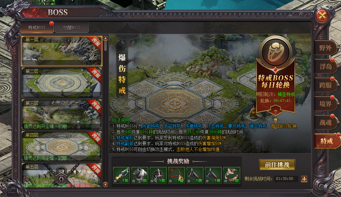特戒BOSS会在防御特戒、生命特戒、恢复特戒、攻击特戒、暴伤特戒和神圣特戒每日依次轮换。每日16点每个特戒BOSS地图会刷出一直觉醒BOSS,最后一刀击杀觉醒BOSS的玩家可以丰厚的归属奖励