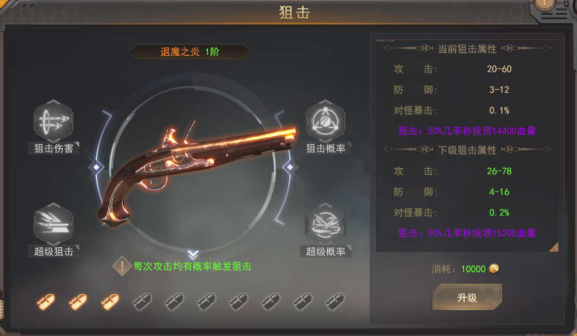 超级狙击:激活后在每次攻击BOSS的时候都有概率触发超级狙击,秒杀BOSS 5%的血量